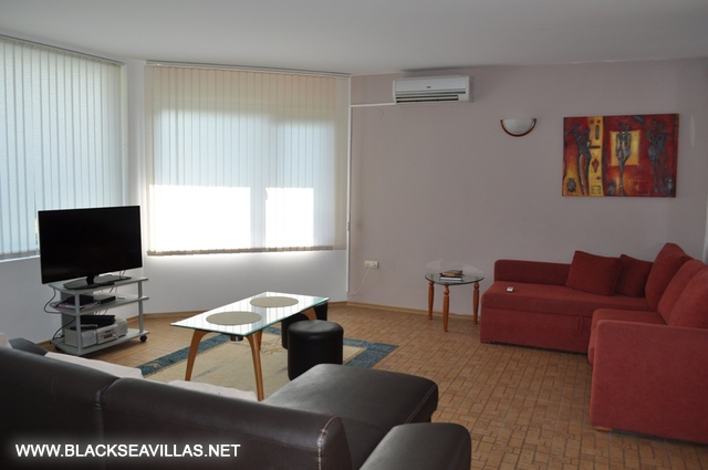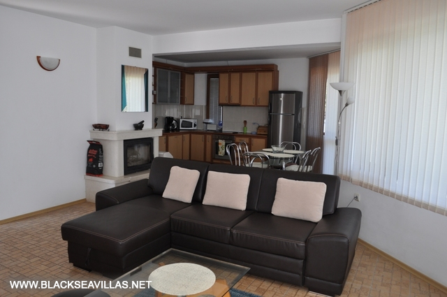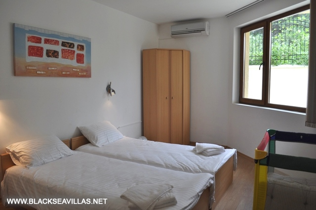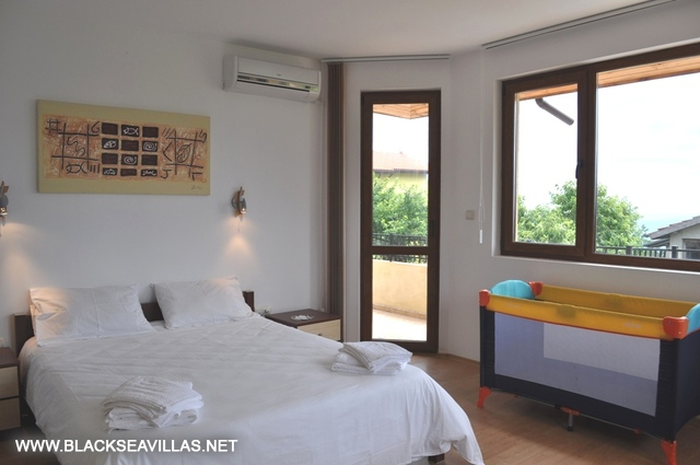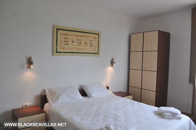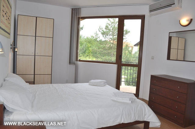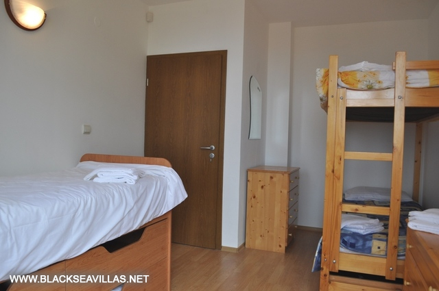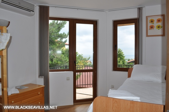 The internal staircase leads to the upper floor, where the three bedrooms are -two double bedrooms (one of them is en-suite with shower-room) and one with two bunk beds for children. Also, from the corridor there is an access to another shower -room with WC for use from the rest two bedrooms. The children’s bedroom and one of the double bedrooms have direct access to the central balcony with partly view towards the sea and Albena resort. The other double bedroom has its own small aside balcony.
