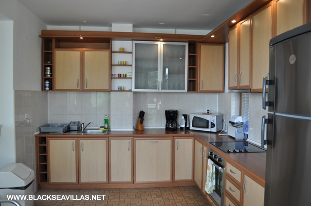 The villa is spread out on 2 floors. The ground floor is a large open plan living room, which incorporates a lounge area with two sofas and Satellite TV/DVD/CD corner, a small dining area with 6 seats and equipped kitchen. The kitchen facilities include refrigerator with freezer, 4 electric hobs, oven, extractor, toaster, microwave, coffee machine, el. kettle, small washing machine. From the living room you can go out to the garden with pool and BBQ area, conveniently surrounded with tall Thuja trees for maximum privacy having in mind the populated villa area. On the same floor there are a twin bedroom with available baby cot, a shower-room and separate WC only.