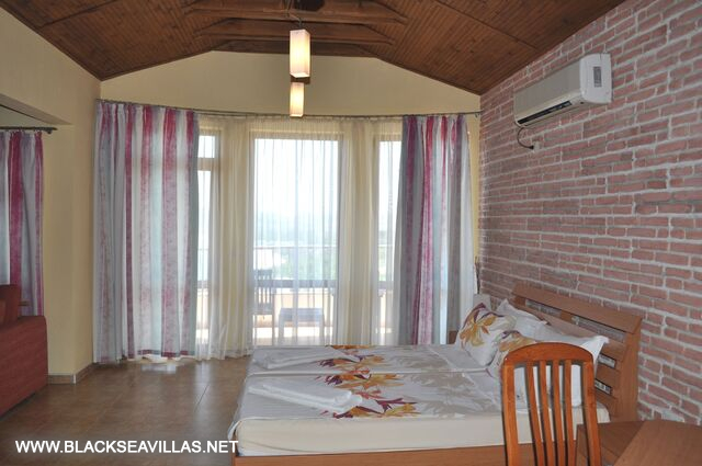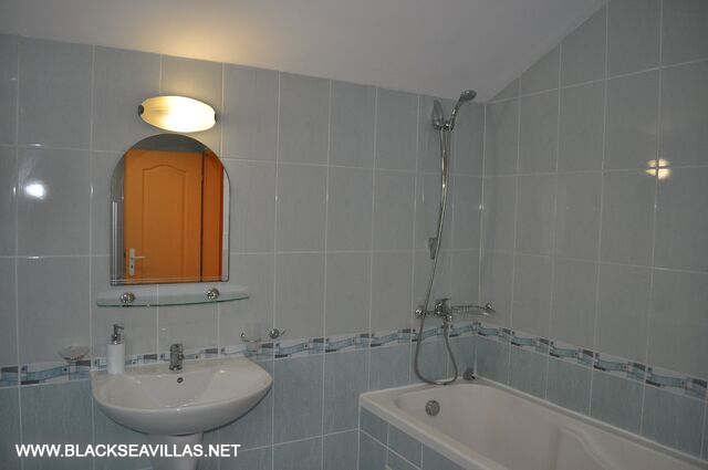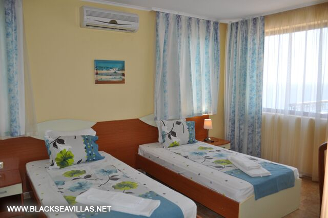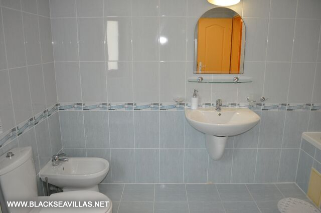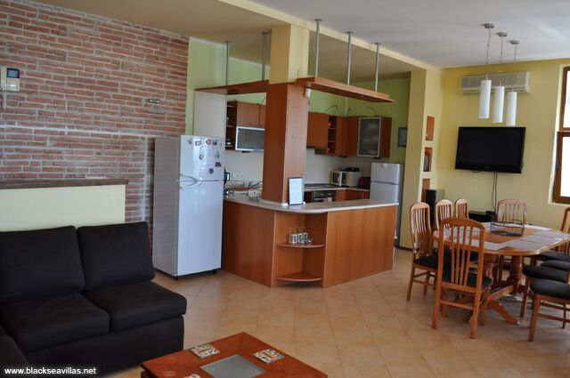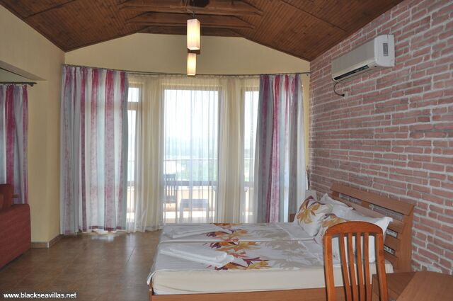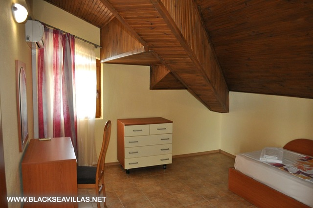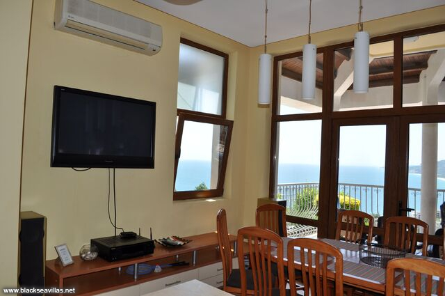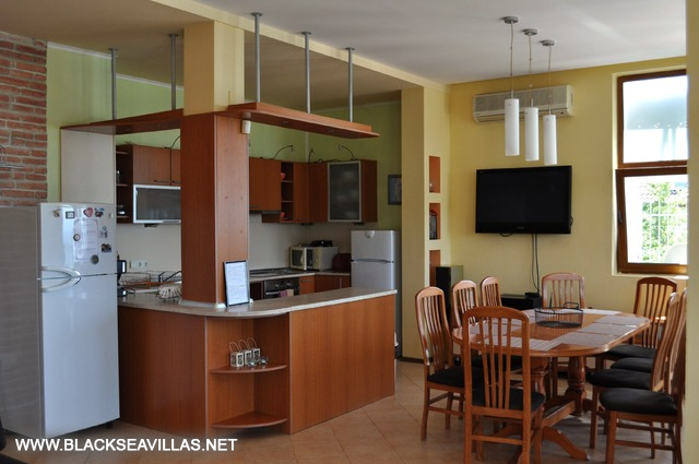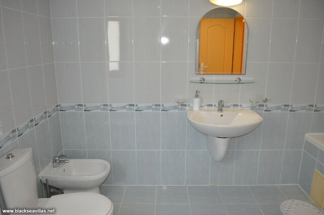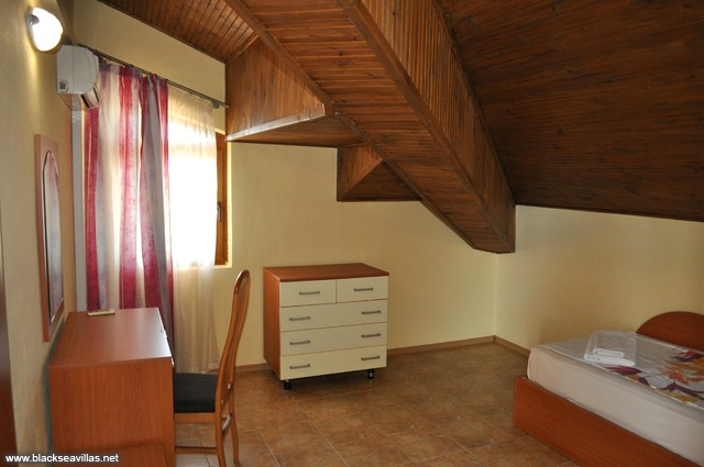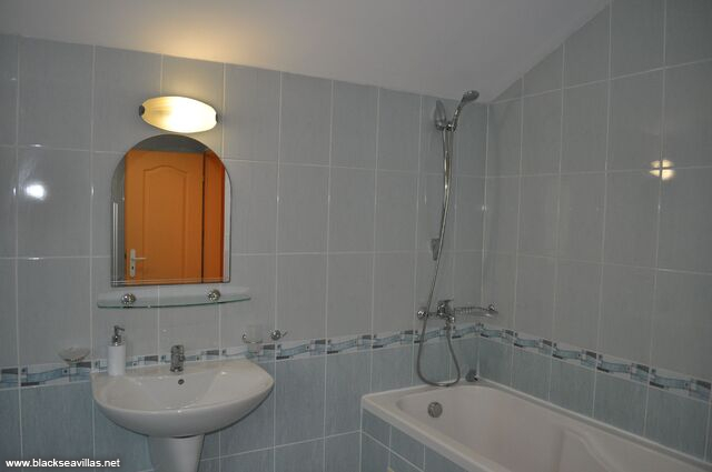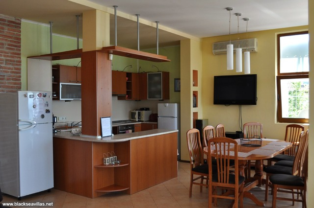 Die Villa hat drei Stöcke und sechs einzelne Schlafzimmer - ein Schlafzimmer mit Doppelbett im dritten Stock und fünf Schlafzimmer mit je zwei Einzelbetten; drei Badezimmer (ein Bad mit Badewanne und zwei Badezimmer mit Duschkabine); ein geräumiges Wohnzimmer mit ausgerüsteter Küchennische; eine Ecke zum Essen und eine Ecke mit Polstermöblen. In jedem Schlafzimmer gibt es einen Kleiderschrank (eine Kommode), Nachttische und Nachtlampen, einen Toilettentisch mit Stuhl und Spiegel, eine Klimaanlage und einen Balkon. Das Kinderzimmer hat vorsichtshalber keinen Balkon. Im Erdgeschoss ist ein Schlafzimmer mit zwei Einzelbetten, Bad + WC. Im zweiten Stock sind drei Schlafzimmer mit je zwei Einzelbetten, die verbunden oder getrennt werden können. In diesem Stock ist auch ein zweites Bad mit Duschkabine. Im dritten Stock sind ein Schlafzimmer mit Doppelbett und ein Bad mit Badewanne sowie das Kinderzimmer mit zwei einzelnen Betten und mit schräger Decke. In der Küche im Erdgeschoss gibt es einen Kühlschrank mit Tiefkühltruhe, einen Geschirrspüler, vier Keramikkochplatten, einen Backofen, eine Dunstabzugshaube, eine Mikrowelle, einen Toaster, eine Kaffeemaschine, einen Wasserkocher. In der Nähe der Küchennische steht der Tisch für acht Personen, und auf der Veranda mit wunderschönem Meerblick gibt es Gartenmöbel für noch 12 Personen. Für die gute Stimmung der Gäste stehen im Wohnzimmer ein Fernseher ("42 -SAT-TV) und ein CD- und DVD-Player, deshalb können Sie auch Ihre Lieblingsvideos und CDs mitbringen. Im Nebenraum im Erdgeschoss sind die Waschmaschine, das Bügeleisen und das Bügelbrett – für Gruppen mit kleinen Kindern besonders notwendig.