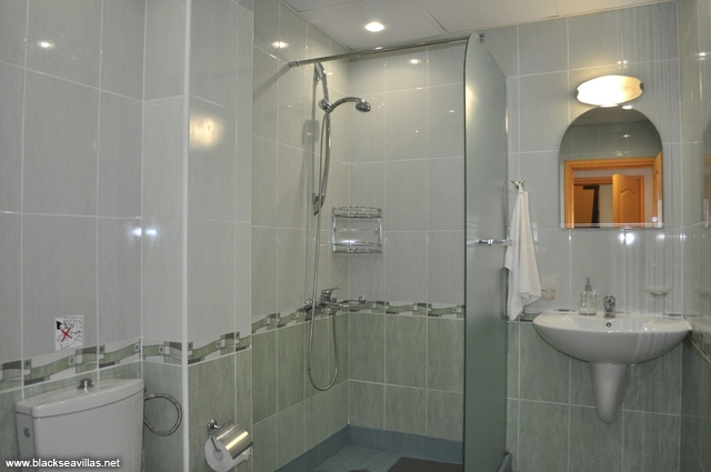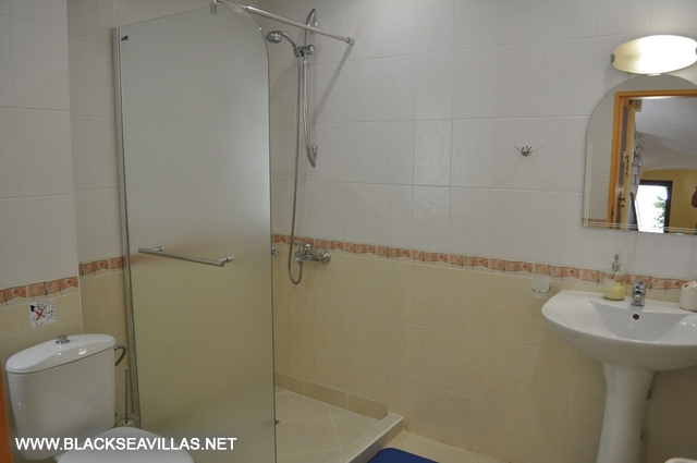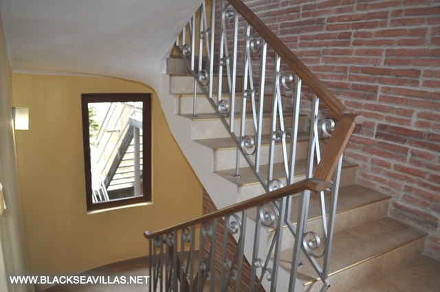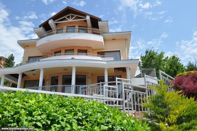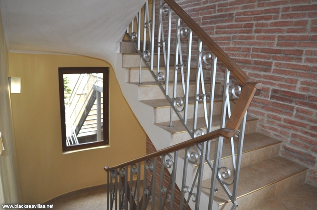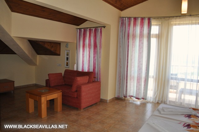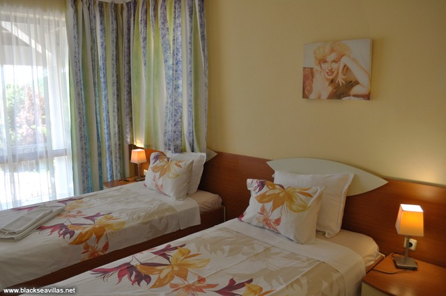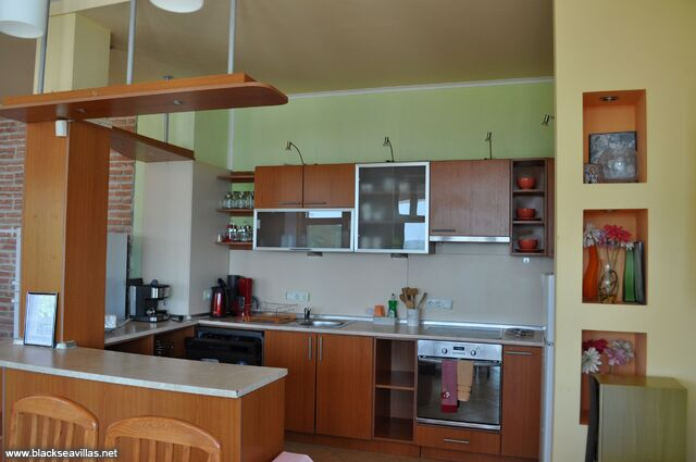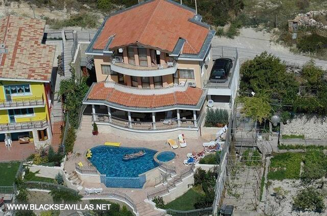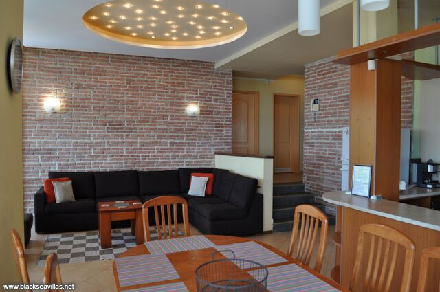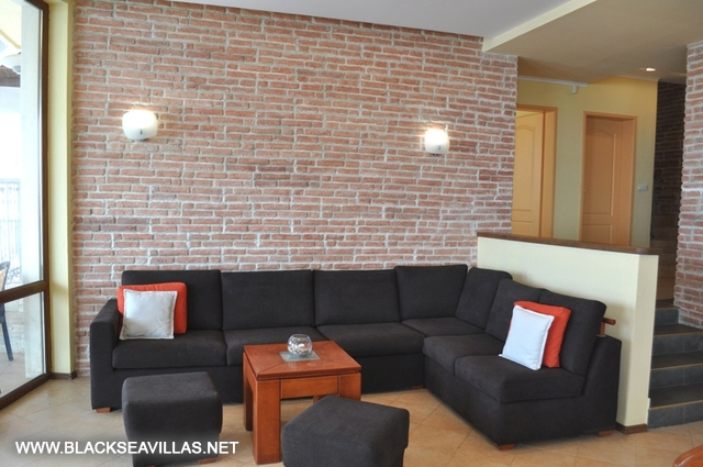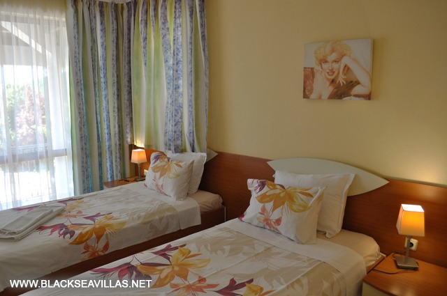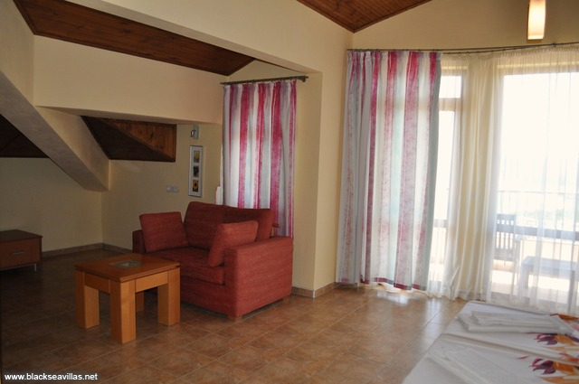 Die Villa hat drei Stöcke und sechs einzelne Schlafzimmer - ein Schlafzimmer mit Doppelbett im dritten Stock und fünf Schlafzimmer mit je zwei Einzelbetten; drei Badezimmer (ein Bad mit Badewanne und zwei Badezimmer mit Duschkabine); ein geräumiges Wohnzimmer mit ausgerüsteter Küchennische; eine Ecke zum Essen und eine Ecke mit Polstermöblen. In jedem Schlafzimmer gibt es einen Kleiderschrank (eine Kommode), Nachttische und Nachtlampen, einen Toilettentisch mit Stuhl und Spiegel, eine Klimaanlage und einen Balkon. Das Kinderzimmer hat vorsichtshalber keinen Balkon. Im Erdgeschoss ist ein Schlafzimmer mit zwei Einzelbetten, Bad + WC. Im zweiten Stock sind drei Schlafzimmer mit je zwei Einzelbetten, die verbunden oder getrennt werden können. In diesem Stock ist auch ein zweites Bad mit Duschkabine. Im dritten Stock sind ein Schlafzimmer mit Doppelbett und ein Bad mit Badewanne sowie das Kinderzimmer mit zwei einzelnen Betten und mit schräger Decke. In der Küche im Erdgeschoss gibt es einen Kühlschrank mit Tiefkühltruhe, einen Geschirrspüler, vier Keramikkochplatten, einen Backofen, eine Dunstabzugshaube, eine Mikrowelle, einen Toaster, eine Kaffeemaschine, einen Wasserkocher. In der Nähe der Küchennische steht der Tisch für acht Personen, und auf der Veranda mit wunderschönem Meerblick gibt es Gartenmöbel für noch 12 Personen. Für die gute Stimmung der Gäste stehen im Wohnzimmer ein Fernseher ("42 -SAT-TV) und ein CD- und DVD-Player, deshalb können Sie auch Ihre Lieblingsvideos und CDs mitbringen. Im Nebenraum im Erdgeschoss sind die Waschmaschine, das Bügeleisen und das Bügelbrett – für Gruppen mit kleinen Kindern besonders notwendig.