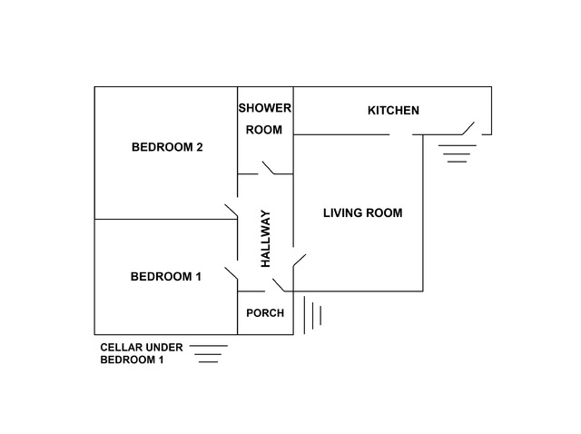 To the front, there’s a large covered porch sheltering the front door, which has a useful security grill for when the house is left unoccupied. And a side door, which also has a grill. Inside, there’s a good sized hallway and nice period panel doors to the rooms. There are two rooms to the left from the hallway and one room to the right. To the rear and accessed by the side door is a small kitchen. Beside the kitchen is a very handy pantry for storing food. Under the house is a stone walled cellar, ideal for wine storage.