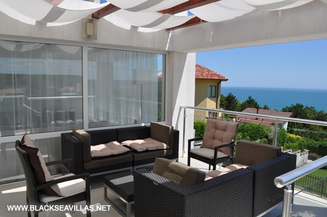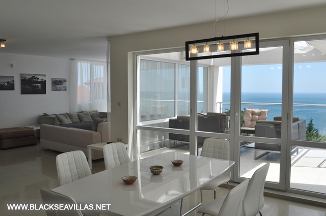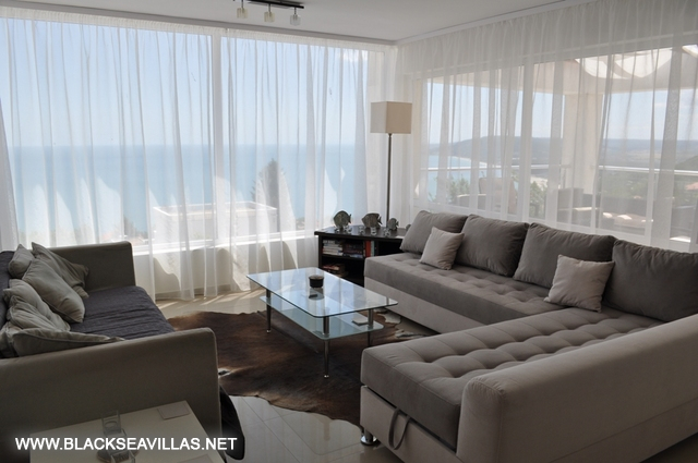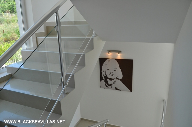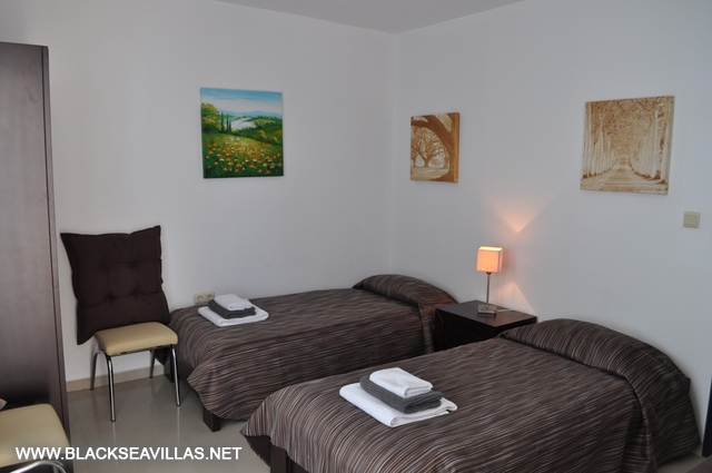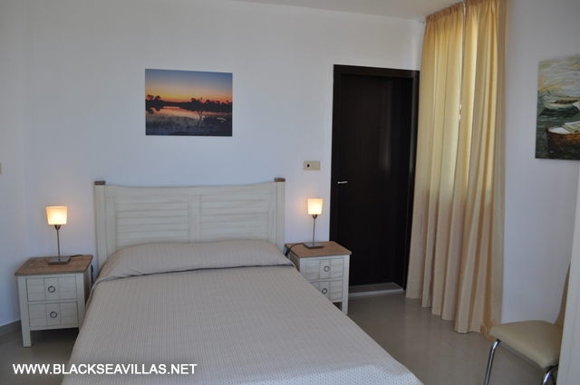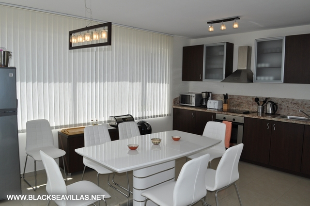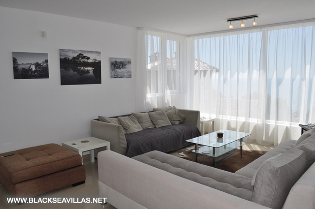 Интерьер виллы очарует вас простотой современного стиля, выдержанного в светлых и свежих тонах, а также и удобная мебель. Просторная гостиная на втором этаже расположена на площади более 65 кв. м. и приятно сочетает в форме буквы Л кухонную зону, обеденную зону и зону отдыха. Кухня оборудована маленьким и большим холодильником, холодильной витриной для напитков, небольшой посудомоечной машиной, духовкой, 4 электрическими конфорками, вытяжкой, стиральной машиной, кофе машиной, микроволновкой, тостером, электрическим чайником и кухонными принадлежностями. Вокруг обеденного стола достаточно места для 8 человек и это могло бы стать идеальным местом для задушевного семейного ужина, если предпочитаете оставаться дома. В зоне отдыха найдете вожделенный комфорт на 3 диванах, плазменный телевизор со спутниковыми каналами. Два дивана раскладные и легко превращаются в дополнительные кровати, тем самым общая вместимость виллы достигает 10 человек. Наружная лестница ведет из гостиной прямо во двор с бассейном. В непосредственной близости от бассейна установлено барбекю, где обязательно проведете спокойные вечера с пищей домашнего приготовления и болгарским красным вином.