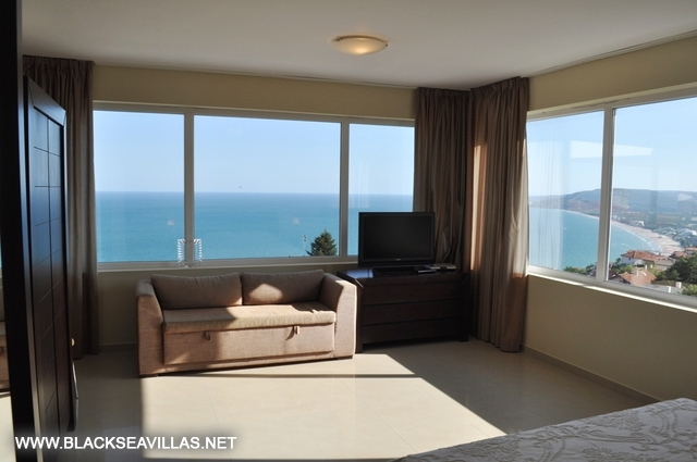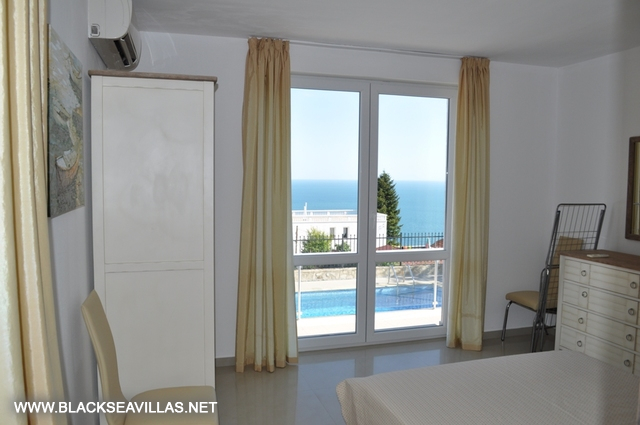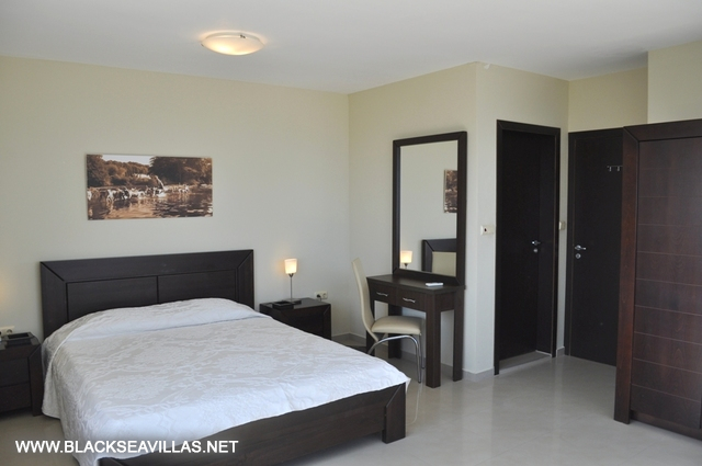 На последнем этаже находится основная спальня с 3 стеклянными стенами, которые раскрывают останавливающий дыхание панорамный вид над морем и дачной зоной вокруг. Она полностью обставлена: комфортабельная двуспальная кровать, туалетный столик с зеркалом, тумбочки с ночниками, гардероб, кондиционер и плазменный телевизор. Из этой спальни прямой выход на террасу, откуда сможете наслаждаться завораживающим видом на курорт Албена.