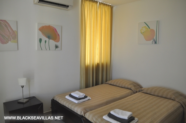 Три спальни на наземном этаже – две из которых с односпальными кроватями, а одна с двуспальной и с собственной ванной – полностью оборудованы: гардероб, туалетный столик с зеркалом, тумбочки с ночниками, кондиционер и имеют прямой выход во двор с бассейном. На этом же этаже в коридоре расположена и отдельная ванная комната с ванной, которую могут использовать гости, проживающие в двух одноместных спальнях.